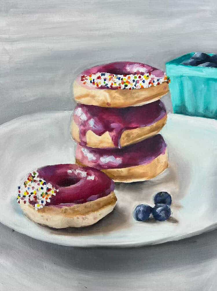 Recently on Instagram, the mother of Sophia Jang reached out to let me know that her daughter had painted a picture of my Baked Blueberry Donuts with Blueberry Lemon Glaze, and asked permission to submit it her painting an art competition. I was honored! And even better, her art won the golden medal!