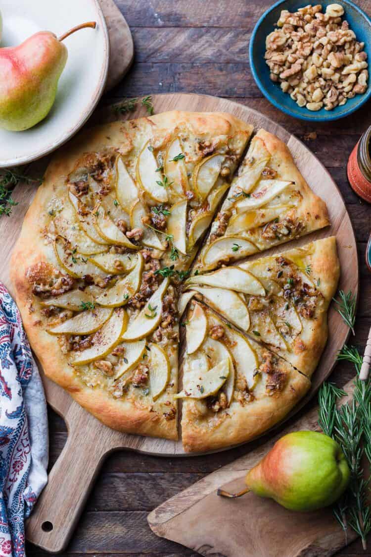 Pear, Walnut and Gorgonzola Pizza – a sweet and savory surprise! Sweet pears, earthy gorgonzola, and crunchy walnuts are drizzled with rich honey for the ultimate autumn flatbread! This is perfect as an appetizer with a glass of wine!