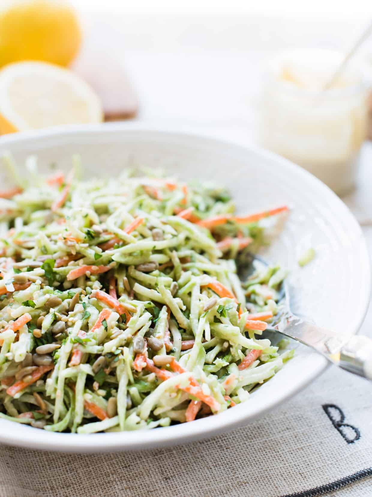 – Stir the dressing into the broccoli slaw and chill until ready to serve.